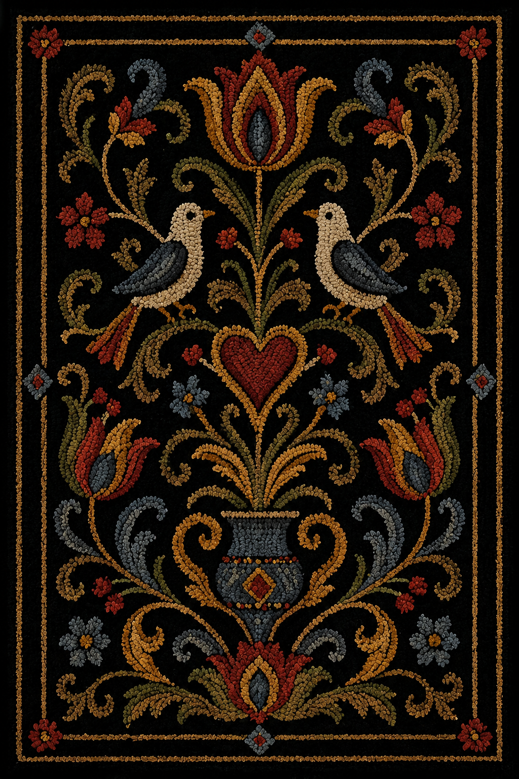 Pennsylvania style Fraktur Floral #3 pattern is on linen